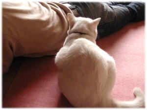 最近、夫の座る側に寝そべるようになったコチカ。