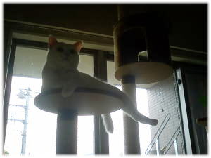 おしっこが済むと、コチカは猛スピードでかけ戻ってきて、キャット・タワーに上った。